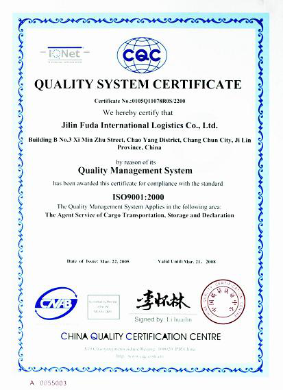 福达物流ISO 9001:2000 质量体系认证